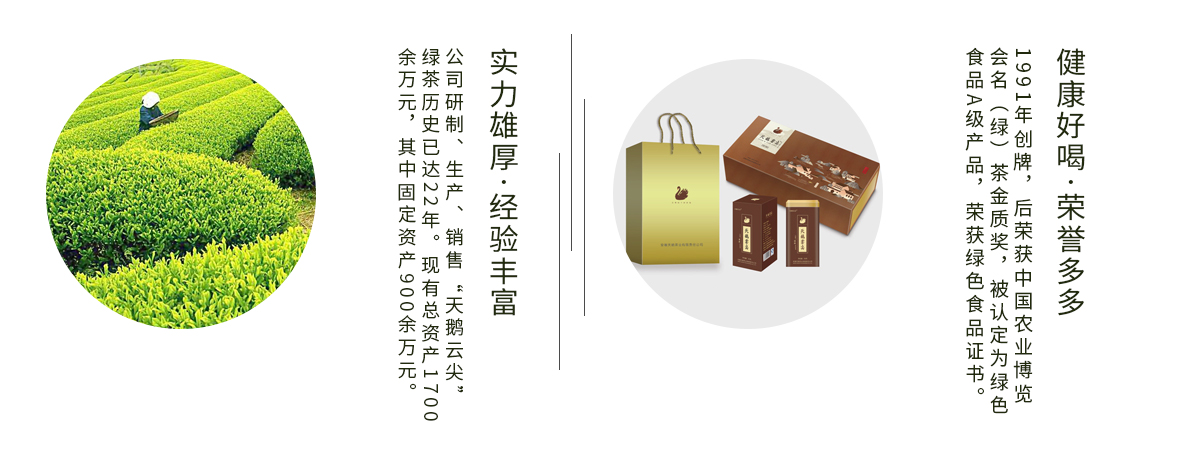 - 安徽天鵝茶業有限責任公司研制、生產、銷售“天鵝云尖”名綠茶歷史已達22年。現有總資產1700余萬元,其中固定資產900余萬元。公司現建茶葉基地500余畝,基地常年云霧繚繞。并擁有標準化車間、先進的電氣智能化生產線及全自動包裝設備,全程清潔化生產。公司在社會各界的關注幫助及員工的努力下,獲得了安徽省茶葉行業協會常務理事單位。“天鵝茶業”由安徽省農業大學楊維時教授指導創制,并受到當代茶圣陳椽教授的指點和親筆題名。1991年創牌,后榮獲中國農業博覽會名(綠)茶金質獎。 公司依托天潤茶業專業合作社建立緊密型茶園基地,以“客...